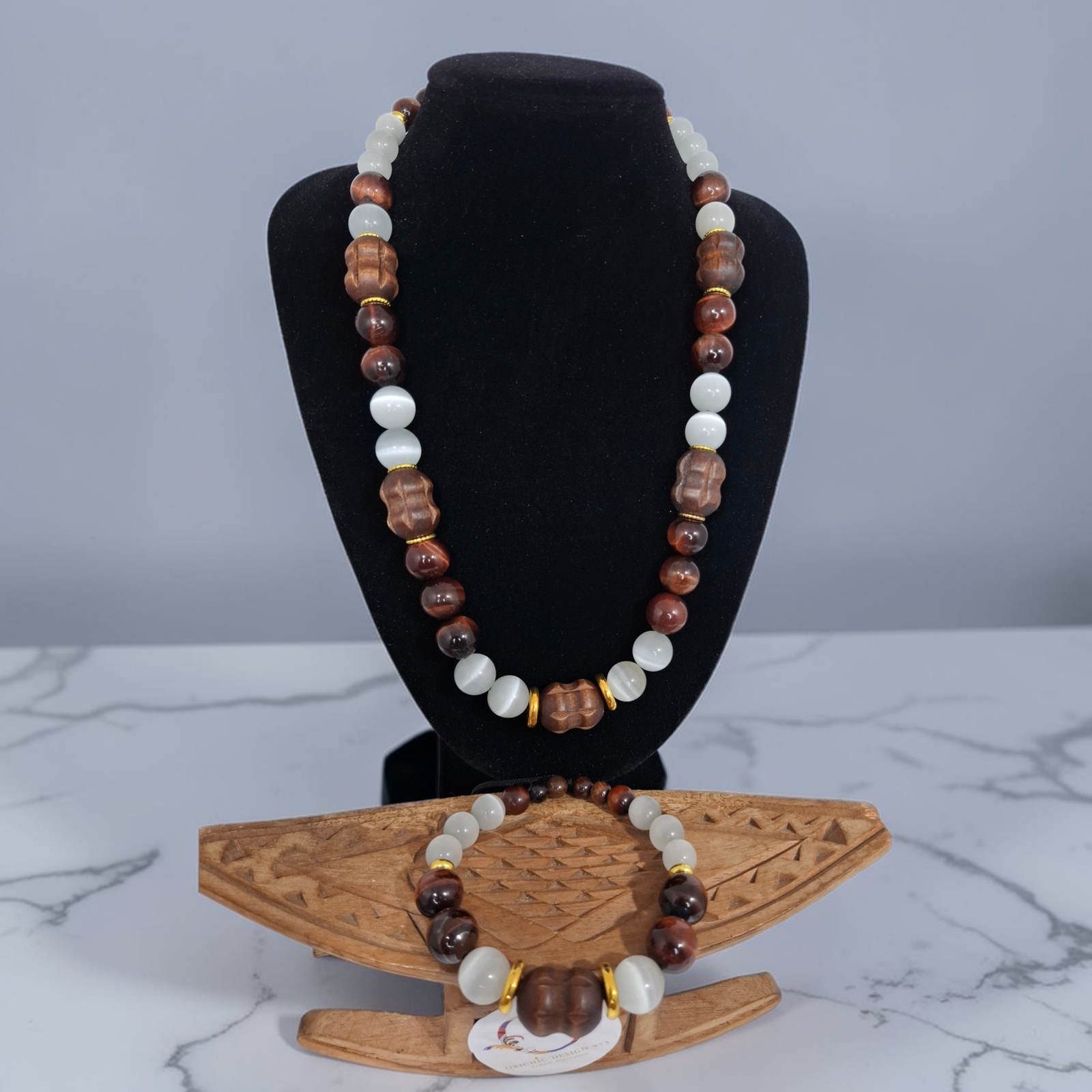 Découvrez la splendeur intemporelle de notre parure en pierres naturelles, composée d’œil de chat, d’œil de taureau et de perles en bois. Ce mélange raffiné allie sophistication naturelle et tradition artisanale, offrant une pièce idéale pour sublimer toutes vos tenues.